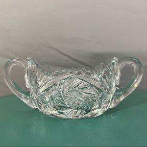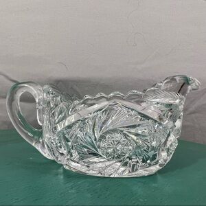 This exquisite vintage cream and sugar set is crafted from hand-cut lead crystal, featuring an intricate starburst and fan design. The deep, sharp cuts catch and reflect light beautifully, creating a dazzling prismatic display. When tapped, the pieces produce a clear, bell-like ring, indicating high-lead-content crystal.