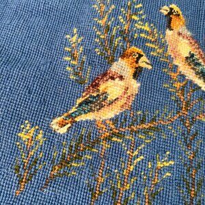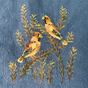 This hand-embroidered tapestry features two birds perched on branches against a blue background. The intricate detailing and vibrant colors add a touch of vintage charm, making it an ideal piece for collectors or home decor enthusiasts.