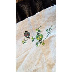 Delicately hand-embroidered tablecloth featuring floral and lantern motifs on soft linen. Adds charm and elegance to dining or decorative setups.