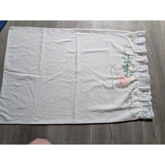 Vintage Hand-Embroidered Pillowcase With Lace Trim & Floral Design