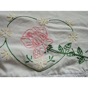 This vintage pillowcase features a hand-embroidered floral design in a heart shape, accompanied by a delicate lace trim. Its craftsmanship adds elegance to any bedroom setting. The soft cotton material ensures comfort, while the embroidered details provide a touch of artistry and nostalgia, making it a charming addition to your home decor.