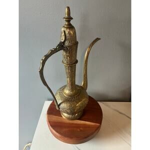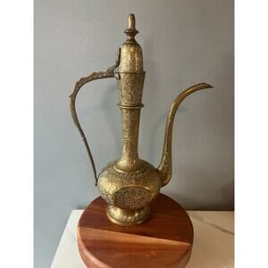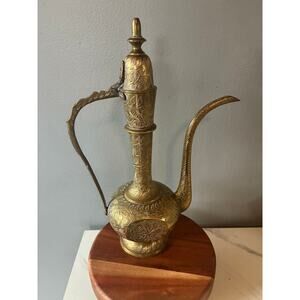 Add a dramatic touch of old-world charm to any room with this vintage solid brass ewer, beautifully hand-engraved with floral and leafy motifs from top to base. This piece features an elegant curved spout, ornate handle, hinged lid, and deep, hand-tooled detailing throughout — the kind that only older, handcrafted brasswork has.