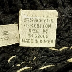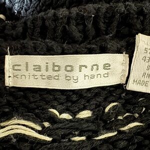 This vintage Claiborne hand-knit sweater features a unique black and white woven texture with a relaxed, cozy fit. Made in Korea with a quality acrylic-cotton blend, this timeless sweater offers a perfect balance of warmth and breathability. The intricate stitching and classic crewneck style make it a standout piece for casual or vintage-inspired looks.