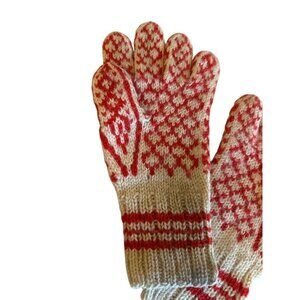 Vintage Hand-Knit Wool Blend Red & Cream Winter Gloves With Snowflake Design