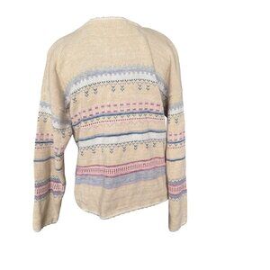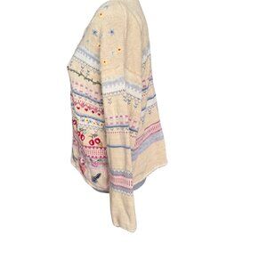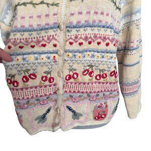 Vintage Hand-Knit Wool Cardigan Sweater With Floral & Cherry Patterns