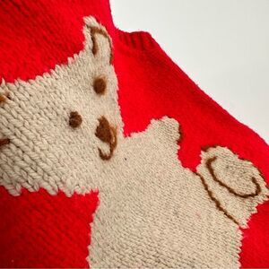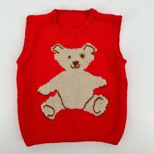 Vintage hand knitted sweater vest. Red with tan teddy bear on front. Handmade without tags. Per measurements, would fit up to a size 5. Modeled on my little guy who wears a 4. Substantial knit so maybe wool. No stains, fraying or piling. See pictures for measurements.