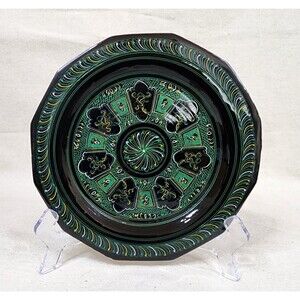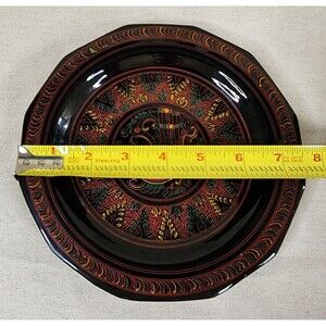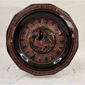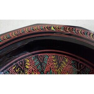 The glossy black lacquered finish forms a dramatic backdrop for the intricate painted designsscrolls, florals, and mythical birds rendered in vivid green, red, yellow, and blue. Whether styled together on a gallery wall, used as accent trays, or displayed on stands, they bring an instant boho-global warmth to any space.