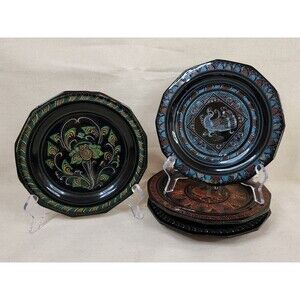 Good vintage condition with normal age-related wear. Some minor chipping on the backs of the plates; one red-patterned plate has edge wear (shown in photos).