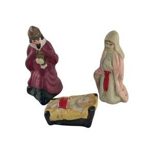 This small vintage Christmas Nativity Scene includes hand-painted bisque figures of Jesus, Mary, and a Wise Man. Perfect for holiday decor or collectors, it adds a touch of tradition to any home.