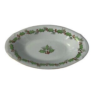 Celebrate the holiday season with this charming vintage porcelain serving bowl. The hand-painted design features bright green holly leaves and red berries accented with fine gold trim, bringing a festive touch to your table. Perfect for serving small sides, candies, or simply as a decorative piece for Christmas gatherings.