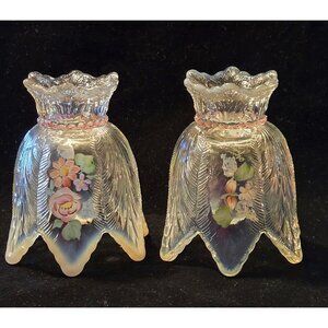 You can use as votives or flip over to use with taper?candles. These vintage Fenton glass candle holders feature a tulip-inspired design complemented by delicate hand-painted floral accents. Crafted to add a touch of elegance to any setting, their translucent construction refracts light beautifully. Ideal for enhancing ambiance in dining or decorative displays. The tips of the petals are finished with an opalescent glass.