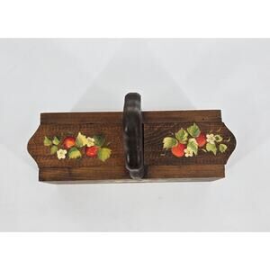 Charming vintage wooden storage box featuring hand-painted strawberries and blossoms on a rich, warm brown finish. The dual sliding lids glide open smoothly to reveal a divided interior, ideal for holding sewing notions, recipe cards, or other small treasures. The tall back with a round cutout allows for wall hanging or easy carrying.
