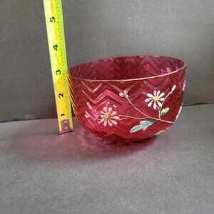 Vintage Hand-Painted Cranberry Glass Bowl Handpainted Floral Design &Chevron Pat