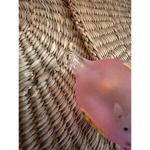 This delicate vintage Easter egg ornament features a hand-painted bunny and Easter egg design on a frosted pink glass surface. A charming collectible for Easter decor or seasonal displays.