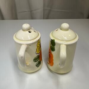 Add nostalgic charm to your kitchen with this vintage ceramic salt and pepper shaker set, featuring cheerful hand-painted orange and yellow flowers on a creamy ivory base. Likely made in Japan circa 1940s–1950s, these petite pitchers have an old-fashioned teapot-style silhouette with spouts and loop handles. Each lid is labeled “S” and “P” respectively and features different hole patterns for salt and pepper.