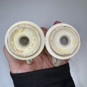 Pre-owned vintage condition. Some surface wear, minor glaze crazing, and staining from age and use, primarily around the handles and bases. No cracks or chips noted. Both pieces have their stoppers. Please see photos for detailed condition.