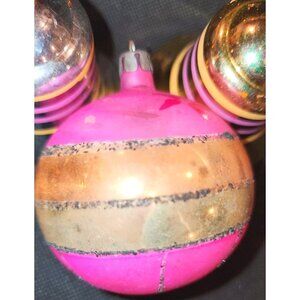 This set of vintage Christmas ornaments, featuring delicate hand-painted designs in vibrant colors, evokes a sense of nostalgia and charm. The glass bells and ball, adorned with intricate pink and gold striping, create an enchanting visual display that captures the festive spirit. These cherished decorations are ideal for adding a touch of vintage elegance to your holiday décor, transforming your Christmas tree into a magical wonderland.