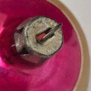 This vintage mercury glass icicle ornament showcases an intricate hand-painted design with vibrant pink and blue hues, adding a classic touch to holiday decor. Shows wear. Circa 1960s Poland printed on metal topper. No breakage, paint wear