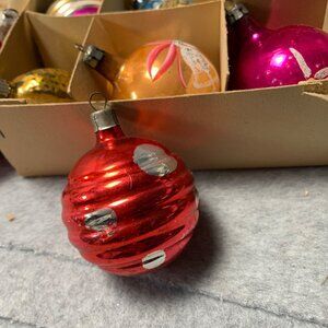 This set of 12 vintage Christmas ornaments showcases hand-painted designs with vibrant colors and intricate details. Each ornament carries a nostalgic charm, echoing the artistry of holiday decorations from past decades. Housed in their original box, these ornaments are both a delightful addition to your collection and a window into holiday history.