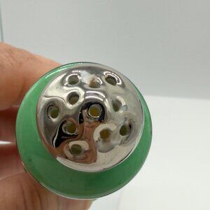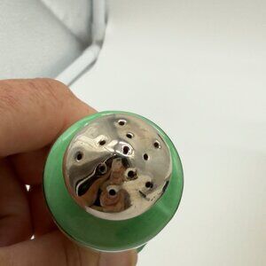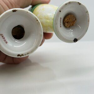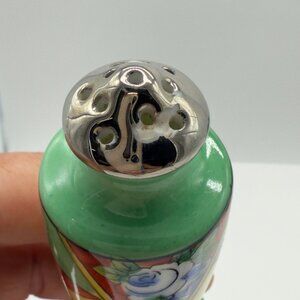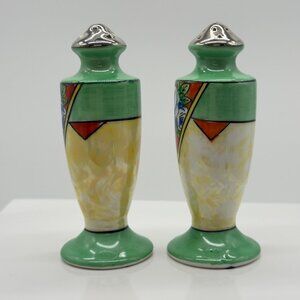 These vintage salt and pepper shakers from Japan feature a hand-painted floral design with vibrant colors. Their intricate design adds a touch of nostalgia and elegance to any dining setting. The gently worn condition speaks to their history, making them a unique addition to any collection.