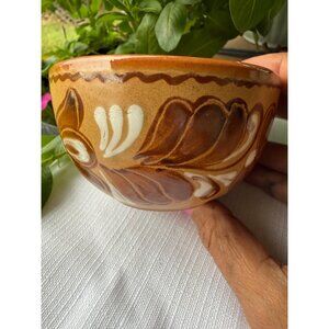 This charming vintage clay bowl features a warm brown glaze with hand-painted cream and dark brown floral designs. The rustic finish and organic shape give it a cozy, handmade feel, perfect for displaying fruit, holding small treasures, or using as a decorative accent in your kitchen or dining space.