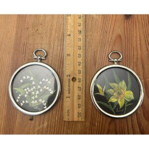 Vintage Hand-Painted Floral Miniature Wall Hanging Ornaments Silver Metal Frames - Set Of 2 1970s