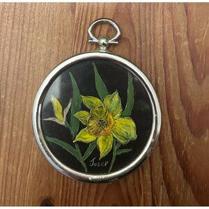 This set of two hand-painted floral ornaments showcases fine craftsmanship, featuring detailed depictions of daffodils and lilies of the valley in silver-tone frames. A unique one of a kind original signed, "Josep".