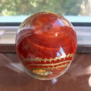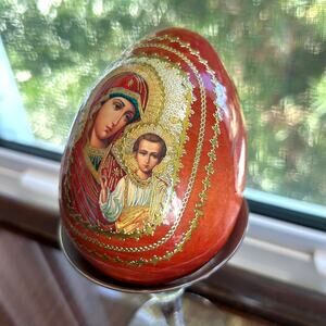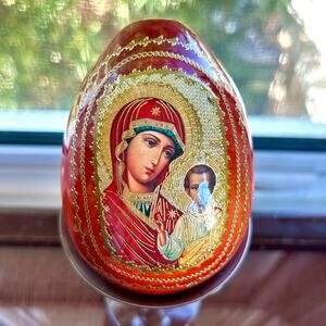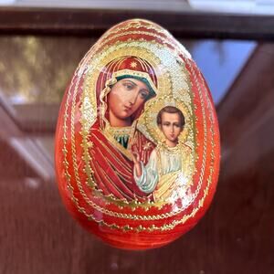 Beautiful vintage hand-painted Orthodox Madonna & Child on an orangish-red tone wooden Easter egg, approximately 4 1/2 inches in height. Featuring intricate details and gold accents, this unique piece captures the elegance of religious art, with the Madonna and Child beautifully depicted on the smooth wooden surface. A perfect addition to any collection or as a thoughtful Easter decoration.