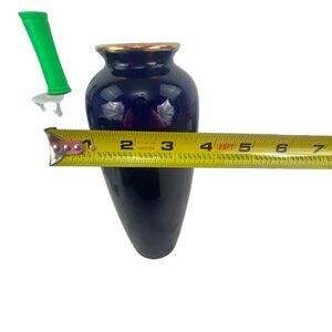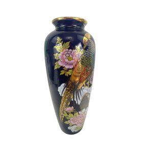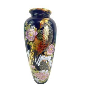 This vintage vase showcases a stunning hand-painted peacock and floral design on a rich, dark blue background. With a height of 12 inches and a width of 5 inches, it serves as an elegant piece for home decor. The fine craftsmanship and intricate details make it a timeless addition to any collection.