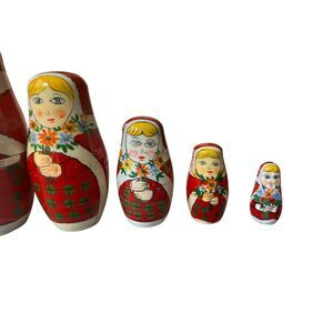 Beautiful vintage Russian Matryoshka nesting dolls set with 5 hand-painted wooden figures. Each doll features vibrant red, green, and floral designs with traditional folk art style. The largest doll opens to reveal smaller ones inside, all the way down to the tiniest figure.