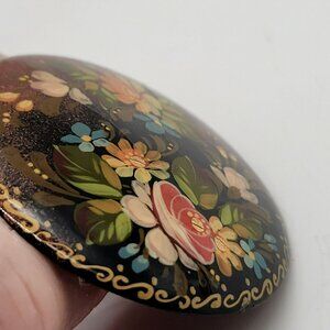 Vintage Hand-Painted Russian Pin Black Lacquer Floral Brooch Gold Accents 2"