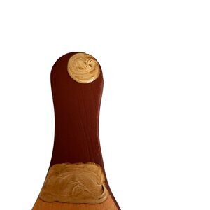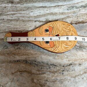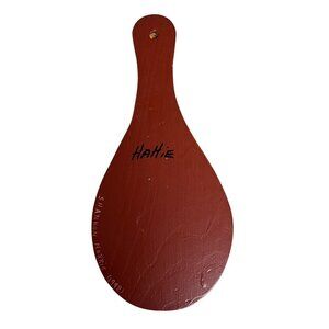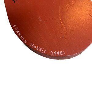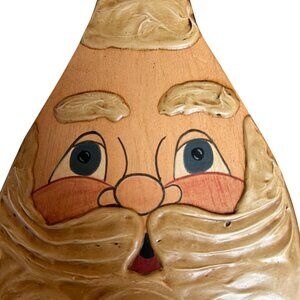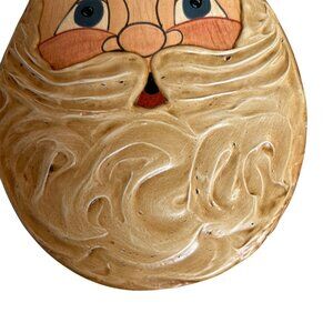 Decorative wooden paddle featuring a hand-painted Santa Claus face. Ideal for holiday-themed wall displays. Crafted in 1992 by artist Shannon Norris.