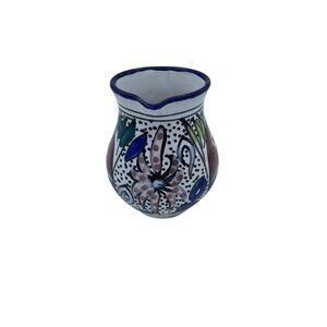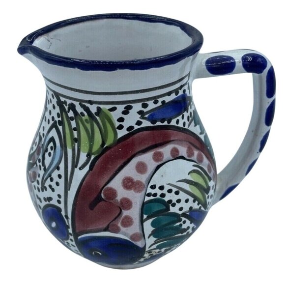 This charming vintage Talavera ceramic pitcher features hand-painted fish and floral motifs with vivid colors and intricate detailing, adding a timeless decorative touch.
