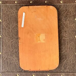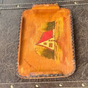 Charming vintage hand-painted wooden tray featuring a cozy A-frame cottage nestled among trees. Scalloped edges and warm tones add a nostalgic, rustic appeal. Perfect as a serving tray or decorative wall piece for farmhouse, cottagecore, or cabin décor. The piece appears to be signed and dated on the front, and a label on the back reads: