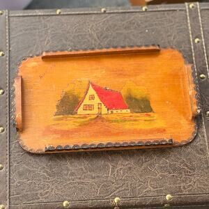 Vintage Hand-Painted Wooden Tray – Cottage Scene – 1940s