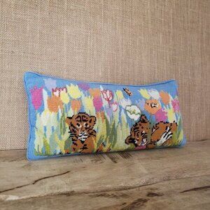 Charming 1960's hand sewn vintage needlepoint pillow features playful tiger cubs in a colorful tulip garden with butterflies on a fine blue backdrop. Rectangle lumbar pillow. Measures approx. 16" L x 8" W. Some wear on edges as shown in photos. Includes pillow insert. Adorable vintage zipper! Great accent pillow for a rocking chair / nursing chair in an animal themed nursery!