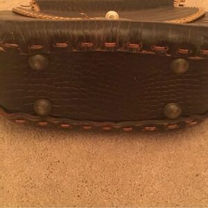 Elegant brown women's bag with a stylish crocodile pattern. Features intricate tan detailing for a sophisticated look. Perfect for any occasion.