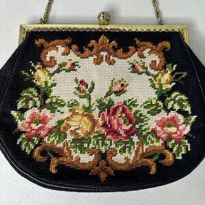 Vintage Handbag Tapestry Needlepoint Evening Framed Black Floral Gold Chain