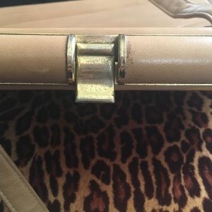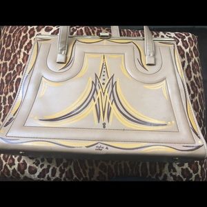 This is a gorgeous vintage leather inspired handbag with a beautiful hand drawn pinstriped design in gold & brown. In awesome condition. Just a light scuff in the front right side & a bit on the bottom right. Not too major/noticeable. A bit of oxidation on the top latch, because it is a vintage bagπ The back is plain with no design. The inside is in perfect condition with no tear whatsoever (it was redone) & is spacious with a little pocket for your items. Measures 10" in tall & 12 1/2" wide.