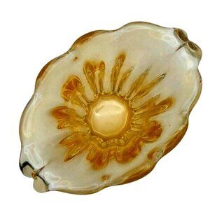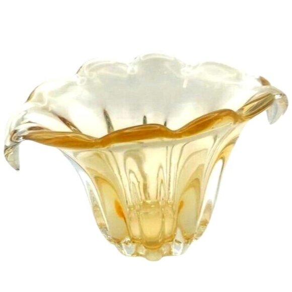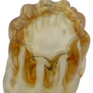 This heavy vintage hand-blown glass vase showcases a delightful amber yellow hue, reminiscent of a bygone era. Its ribbed design and fan shape add a touch of sophistication, making it an elegant addition to any collection of vintage glassware. The craftsmanship reflects the artistry and attention to detail associated with vintage pieces.