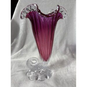 Vintage Handblown Cranberry Glass Cornucopia Vase with Ruffled Edge