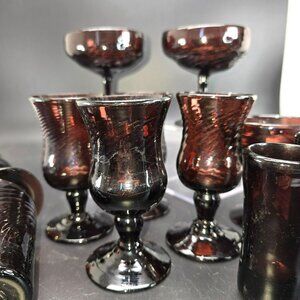 This set of vintage handblown dark pink/amethyst glassware includes elegant goblets and tumblers, showcasing a timeless design. Ideal for collectors or refined dining.