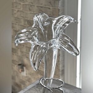 Tags: glass flower sculpture, crystal lily decor, clear glass art, floral glass figurine, blown glass flower, decorative glass stem, elegant glass vase, modern floral decor, silver base decor, glass centerpiece, art glass flower, handcrafted glass art, home accent piece, botanical sculpture, glass art decor, contemporary floral display, table decor, luxury glass ornament, flower lover gift, statement decor piece, classic, unique, minimalist, whimsical, serene, simplistic, timeless, shabby chic, heirloom, antique, estate, keepsake, unique, traditional, timeless, Glass.