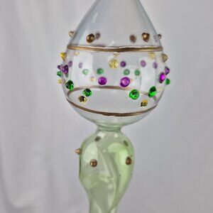 Vintage Handblown Glass Painted Finial Ornaments. 6 all together; 5 are a set and the 6th one is different. Five glass finial ornaments: 3 with raised polka dot trim and 2 with gold tone swirl rings. Tiered embellished blown glass with a swirl pattern; pastel colors. The set of 5 were once sold at the Bronner’s Christmas Wonderland in Frankenmuth Michigan in the 1980's. The 6th ornament is also blow glass in multi colors. Elegant and delicate ornaments bring vintage charm to your decor. I've added the hooks to the ornaments and have included an extra one in case you want the 6th ornament to have a matching hook. Preowned- in great shape; some fading of the color in some of them. One of the 5 has a handmade imperfection - please see pictures. Please see pictures for approximate measurements. Vintage, handblown, Christmas ornaments, vintage charm.