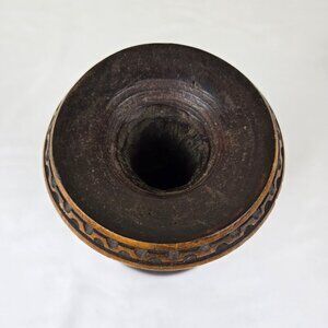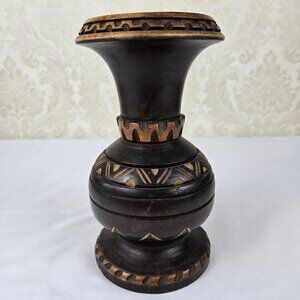 This vase has been handcrafted from a single piece of wood. Two tone carved details. This is a vintage piece and has imperfections in the wood.