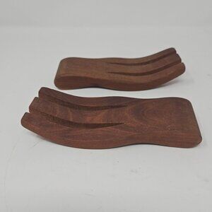 Up for offer here is a pair of vintage, Mid Century Danish Modern style, hand carved teak wood salad serving tongs, in the form of forks without handles. Excellent Condition. Measures approximately 6.75" x 3" x .75".