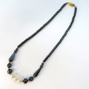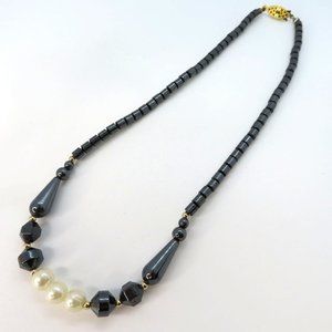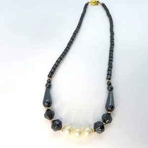 Vintage Handcrafted Black Onyx Necklace Faux Pearls