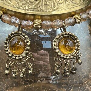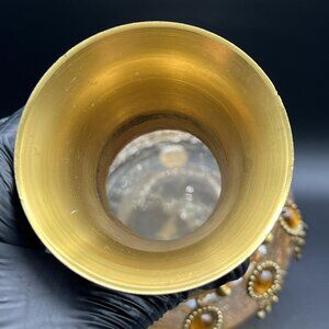 Vintage Handcrafted Bohemian Floral Engraved Gold Brass Neck Ornate Design Amber Crackle Glass Vase