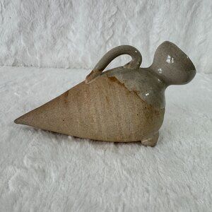 Vintage Handcrafted Ceramic Amphora Style Vase Handle Tripod Base Beige & Gray
