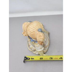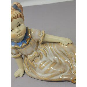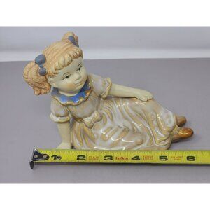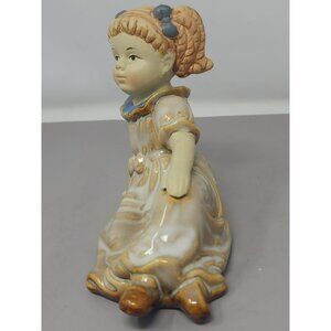 This vintage ceramic figurine depicts a young girl in a detailed dress, featuring charming pigtails with blue bows. Ideal for collectors or as a decorative piece in home settings, its craftsmanship and nostalgic design provide a timeless appeal.